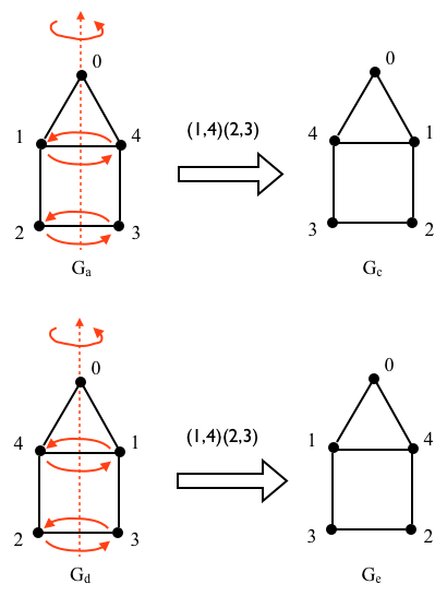 As we might have already guessed, what is at play in automorphisms is the preservation of adjacency via permutations that preserve the symmetry of the graph. We can reflect either \(G_a\) or \(G_d\) about their vertical axis, and end up with the same drawing, albeit labeled in a different way.