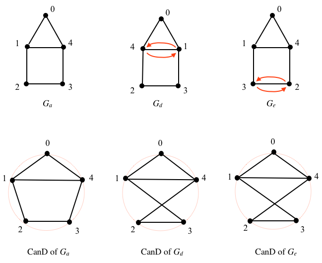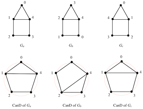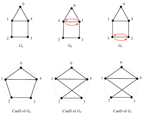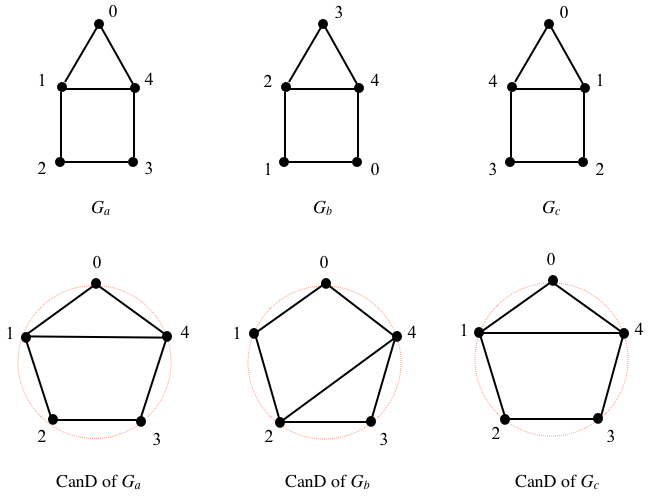 A Canonical Drawing, a.k.a. a CanD, is a drawing of a labeled graph with the labels ordered in a circular fashion, at equal angles between them. Consider the following labelings of a graph \(G\) and their CanDs: