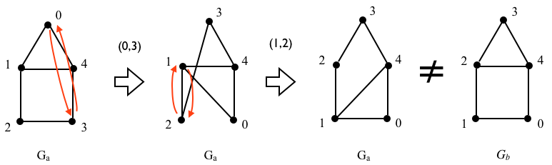 It turns out that \(v_0\), \(v_3\) and \(v_4\) of both \(G_a\) and \(G_b\) have the same degrees – 2, 2, and 3 – but \(v_1\) and \(v_2\) do not, so we don’t even need to check for adjacencies: \(G_b\) is not an automorphism of \(G_a\). The effect of the \(P_{a \rightarrow b} = [3,2,1,0,4]\) permutation is clear when we write it in cycle notation: \(P_{a \rightarrow b} = (0,3)(1,2)\), which is two transpositions. Graphically, when we reposition the vertices of \(G_a\) to match the positions of the vertices of \(G_b\), the repositioned drawing of \(G_a\) and the drawing of \(G_b\) don’t match: