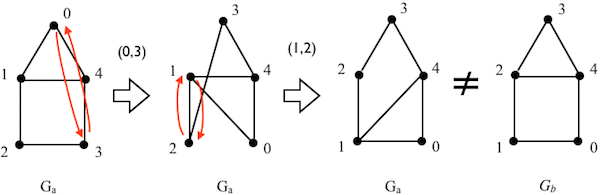 It turns out that \(v_0\), \(v_3\) and \(v_4\) of both \(G_a\) and \(G_b\) have the same degrees – 2, 2, and 3 – but \(v_1\) and \(v_2\) do not, so we don’t even need to check for adjacencies: \(G_b\) is not an automorphism of \(G_a\). The effect of the \(P_{a \rightarrow b} = [3,2,1,0,4]\) permutation is clear when we write it in cycle notation: \(P_{a \rightarrow b} = (0,3)(1,2)\), which is two transpositions. Graphically, when we reposition the vertices of \(G_a\) to match the positions of the vertices of \(G_b,\) the repositioned drawing of \(G_a\) and the drawing of \(G_b\) don’t match: