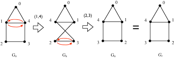 Finally, let’s permute the labels of \(G_a\) using the \(P_{a \rightarrow c} = [0,4,3,2,1]\) permutation to obtain the \(G_c\) labeling, and compare the degrees of the vertices of \(G_a\) against those of \(G_c.\) In this case all the vertices of \(G_a\) have the same degrees as those of \(G_c,\) e.g., the degree of \(v_i,\) for all \(i,\) is the same in both graphs. As for the vertex adjacency, it has been preserved as well because the AVLs and CanDs of \(G_a\) and \(G_c\) are equal. Indeed, when we reposition the vertices of \(G_a\) to match those of \(G_c\), the drawings of the permuted \(G_a\) and \(G_c\) do match, so \(G_c\) is an automorphism of \(G_a.\) This permutation in cycle notation is \(P_{a \rightarrow c} = (1,4)(2,3)\) – again, two transpositions: