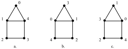 If the order of graph \(G\) is \(n\), then we can shuffle the labels of its vertices in \(n!\) possible different ways, i.e., there are \(n!\) permutations. In our example, since the order of \(G\) is \(n=5\), there are \(n! = 120\) possible permutations and thus, 120 different labelings; indeed, we can first label any one vertex with any of the 5 labels, and then label another vertex with any of 4 remaining labels, then a third one with any of the 3 remaining labels, and so on; the labelings of \(G\) shown as \(G_a\), \(G_b\), and \(G_c\), are 3 of these 120 possible labelings. Their AVLs are: