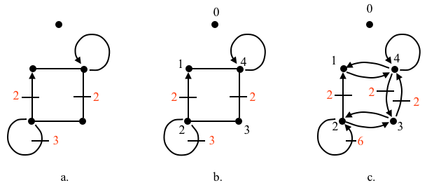 A more general example is that of an unlabeled disconnected pseudo digraph with multiple loops, edges and isolated vertices. Again, we label the vertices in an arbitrary fashion, and then we recast the edges as arcs to find the vertex adjacency and arc multiplicity. For visualization purposes, we have colored the multiplicity tick marks in red. Again, let’s call it graph \(G\).
