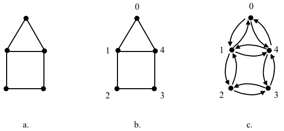 Let’s represent an unlabeled simple undirected graph with an AVL. First we label the vertices in an arbitrary way, e.g., we’ll label them counterclockwise starting from the top. Then we think of the edges as arcs so we can tell the adjacency between vertices.