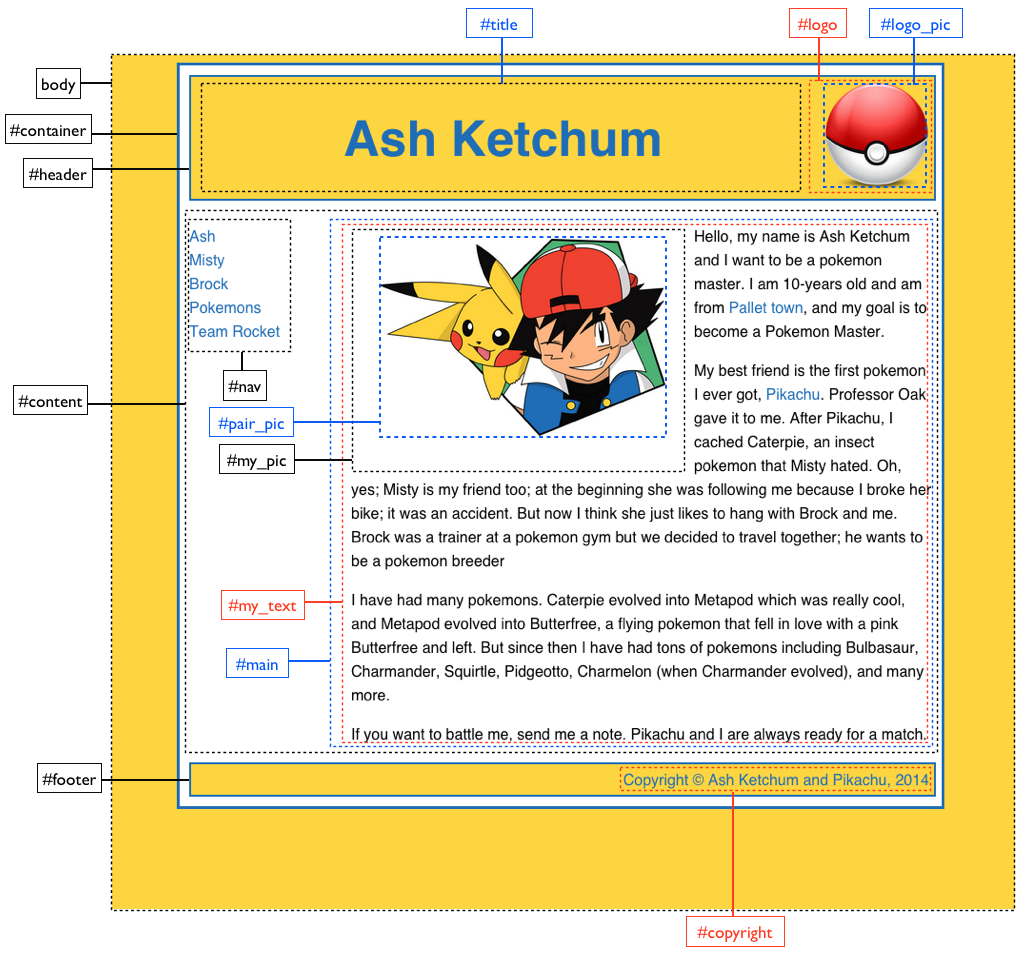 The areas are general containers. For example, we have the area called “#container” that contains three sub-areas: ‘#header’, which has the content of the header; ‘#content’, which has the content of the page; and ‘#footer’, which has the content of the footer. As another example, ‘#content’ has only two sub-areas: ‘#nav’, which has the navigation menu, and ‘#main’ that has all the text and images. Our actual content, i.e., the text, images, and links, (all drawn in red) will show up at the leaves of our tree of nested areas: