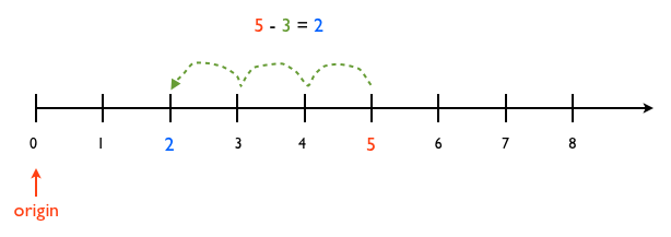 We can also visualize addition using the number line, which does not break down when the result is negative. We can handle subtractions that result in positive numbers: